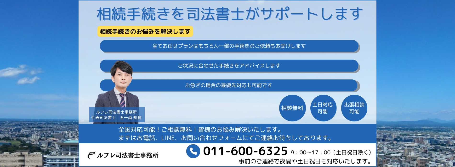 当事務所へのご依頼やお問い合わせは、お電話、LINE、下記のお問い合わせフォームからお願いいたします。24時間以内(土日祝日・定休日を除く)にご連絡いたします。また、相続について専用のお問い合わせフォームをご用意いたしましたので、是非ご利用ください。